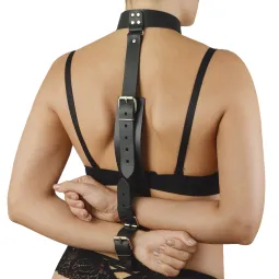 Комплект-фиксатор Новичок изготовлен из натуральной кожи и металлической фурнитуры. Изделие регулируется, что позволяет откорректировать размер под различный рост. Ошейник и наручники зафиксированы на основе (не съемные). Регулируются также металлическими пряжками.
