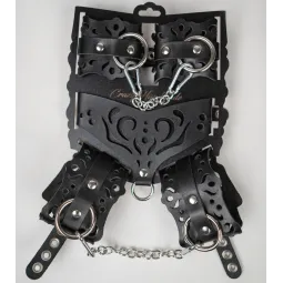 Набор ажурный выполнен из кожи и металической фурнитуры. В набор входит ошейник, наручники и оковы.