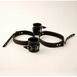 Бандажная система ручной работы. Выполнена из натуральной кожи чёрного цвета . В комплект входят наручники и петли для фиксации ног. Наручники можно использовать отдельно. Размер регулируется. В фирменной упаковке.