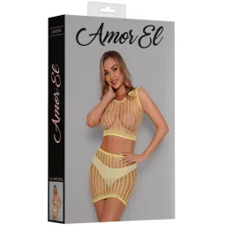Комплект яркого и соблазнительного сетчатого белья, состоящего из полупрозрачного топа и короткой юбки. Благодаря использованию большего количества нейлона, белье сохраняет очертания, не деформируется, растягивается и выгодно облегает фигуру. А за счет эластана, даже после сильного растяжения, оно не деформируются, и всегда принимает исходную форму. Изделие не вызывает аллергию, не окрашивает. Уход и стирку следует производить в соответствии с инструкцией завода-изготовителя на упаковке. Коллекция: Amor El Цвет: жёлтый Размер: S/L (42-46) Материал: 94% нейлон, 6% спандекс