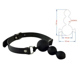 Силиконовый кляп в виде, последовательно расположенных, трех сфер, прикреплен к ремешкам из натуральной кожи. Регулируется кляп при помощи металлической пряжки. Металлическая фурнитура имеет никелевое покрытие. Общая длина 59 см. Max диаметр шара 38 мм, длина кляпа 10 см. Ширина ремешков 25 мм.
