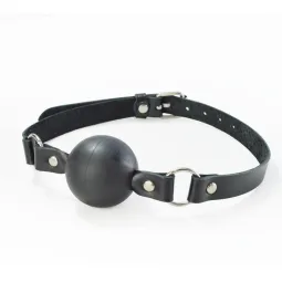 Кляп изготовлен из натуральной кожи черного цвета и регулируется при помощи пряжки. Шар имеет диаметр 45 мм.