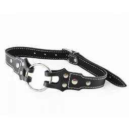 Ремешки кляпа изготовлены из натуральной кожи и декорированы белой строчкой. Кольцо имеет никелевое покрытие. Диаметр 36 мм