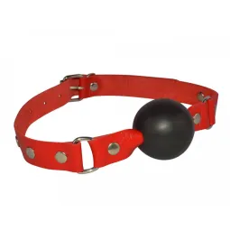Ремешок изготовлен из натуральной кожи красного цвета. Никелированная пряжка. Шар изготовлен из латекса. Размер универсальный, диаметр шара 4 см. Один из самых распространённых атрибутов BDSM.