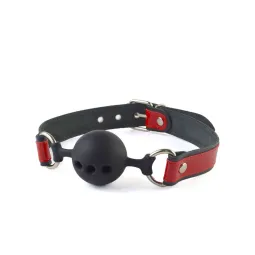 Силиконовый кляп-шар с ремешками из натуральной кожи черного цвета. Вдоль ремешков проходит лаковая кожаная накладка красного цвета. Регулируется девайс при помощи металлической пряжки. Металлическая фурнитура имеет никелевое покрытие.