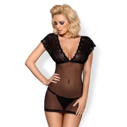 Сорочка в мелкую сеточку, верх выполнен из кружевного материала, в комплект входят трусики.