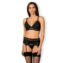 Женственный комплект белья черного цвета, состоящий из трех предметов. Бюстгальтер с формованными чашечкам декорирован кружевом. Тонкие бретели изготовлены из бархатистой ткани и элегантно перекрещиваются на спине. Сзади застежка на крючки. Место соединения бретелей и бра украшено круглыми золотистыми украшениями. Пояс для чулок с высокой посадкой также декорирован кружевом. На ягодицах пикантная шнуровка. Пажи регулируются по длине. Мини стринги входят в комплект.