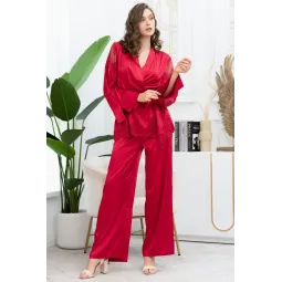Элегантный комплект Mia-Amore - состоит из жакета с длинным рукавом, широких брюк и кружевного бралетта, выполнен из смесового шелка и дополнен кружевными вставками. Линию талии можно подчеркнуть за счет широкого пояса с кружевными вставками на концах, который идет в комплекте.