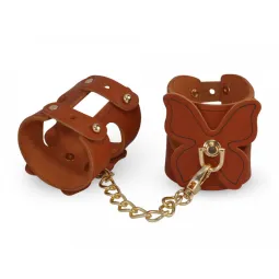 Изготовлены из натуральной кожи. Цвет рыжий. Наручники легко трансформировать в обычный браслет, убрав соединительную цепочку.
