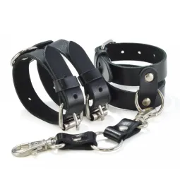 Наручники изготовлены из ременной кожи. Фурнитура никелированная. Регулируется при помощи пряжки. Наручники имеют кожаную перемычку с двумя карабинами.