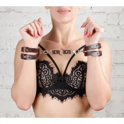 Наручники изготовлены из ременной кожи. Фурнитура никелированная. Регулируется при помощи пряжки. Наручники имеют кожаную перемычку с двумя карабинами. Цвет шоколад.