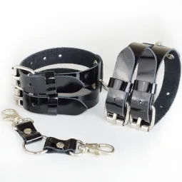 Наручники изготовлены из натуральной лаковой кожи. Фурнитура никелированная. Регулируется при помощи пряжки. Наручники имеют кожаную перемычку с двумя карабинами.
