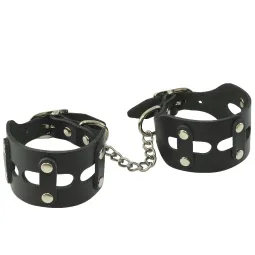 Наручники изготовлены из натуральной кожи. Размер регулируется при помощи металлической пряжки. Наручники соединены цепочкой.