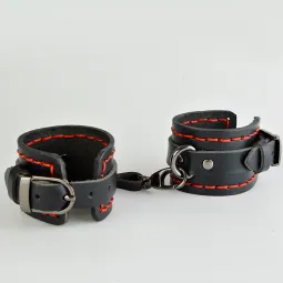 Наручники изготовлены из натуральной кожи черного цвета и декорированы красной строчкой. Регулируются при помощи пряжек. В комплекте с наручниками идет кожаная перемычка с карабинами.