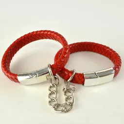 Наручники состоят из плетеного винилового шнура шириной 11 мм и магнитных застежек. Общая длина наручника 20 см. Чтобы получился ошейник с подвеской цепочкой, необходимо наручники соединить между собой.