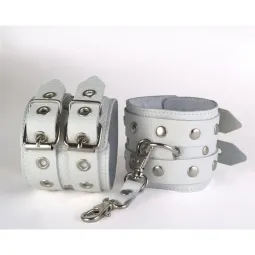 Наручники. Изготавливаются из натуральной кожи с велюровой подкладой. При изготовлении использована фурнитура с никелевым покрытием. Между слоем основы и подкладой проложена мягкая прокладка. Соединяются между собой коротким ремешком с двумя карабинами на концах. Не нарушают кровообращение, надёжно фиксируются на запястьях с помощью двух ремешков. Размер универсальный. Цвет: белый.
