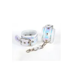 Наручники – специализированное приспособление для обездвиживания партнера при эротических ролевых играх и практиках БДСМ. Аксессуар состоит из двух широких полос из плотной натуральной высококачественной кожи белого цвета, украшенных вставками из особого голографического материала перламутрового цвета, соединенных между собой снимающейся короткой сцепкой в виде карабинов. По краю наручников проходит оторочка, обеспечивающая комфорт при ношении.