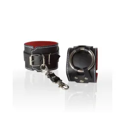 Черные наручники из натуральной кожи помогут ограничить движения секс-партнёра, достаточно лишь одеть на запястья комфортный, но прочный девайс. Лаконичные, но при этом красивые наручники подойдут, как для женщин, так и для мужчин, так как размер легко регулируется при помощи металлической пряжки. Готические фигурные накладки, удерживающие большое металлическое кольцо, придают наручникам агрессивной сексуальности и роскоши. Соединяются наручники при помощи небольших карабинов, скреплённых кожаной перемычкой. Для комфортного использования внутренняя часть наручников выполнена из бархатистой красной велюровой кожи. Вся металлическая фурнитура имеет никелевое покрытие. Размер универсальный.