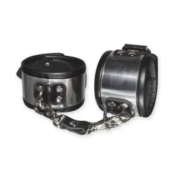 Потрясающе эффектные наручники, с декоративной отделкой имитирующей металл, окунут Вас в безграничный и эпатажный мир BDSM. Изготовлены наручники из натуральной высококачественной кожи чёрного цвета. Для соединения наручников используются два карабина соединенных между собой кожей, которые крепятся к полукольцам. Вся металлическая фурнитура имеет никелевое покрытие. Размер универсальный.