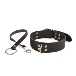 Ошейник изготовлен из натуральной кожи черного цвета. Поводок в виде кожаной ленты с карабином с одной стороны и колечком с другой. Регулируется при помощи пряжки.