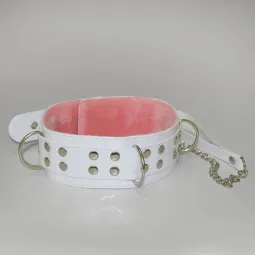 Белый ошейник выполнен из лакированного кожзама, внутри отделан искусственным мехом розового цвета.