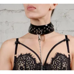 Изготовлен из натуральной лаковой кожи. При изготовлении использована никелированная фурнитура. Ширина ошейника 45 мм, длина цепочки (поводка) с карабином 50 см. Размер универсальный. Один из основных атрибутов BDSM