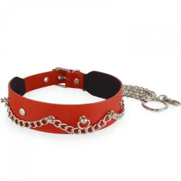 Ошейник изготовлен из натуральной кожи с велюровой подкладой. При изготовлении использована никелированная фурнитура. Ширина ошейника 30 мм, украшен цепью, длина цепочки (поводка) с карабином 50 см. Один из основных атрибутов BDSM. Цвет: красный.