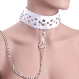 Ошейник белоснежный. Изготовлен из натуральной кожи с велюровой подкладой. При изготовлении использована никелированная фурнитура. Ширина ошейника 45 мм, длина цепочки (поводка) с карабином 50 см. Размер универсальный. Один из основных атрибутов BDSM. Цвет: белый.