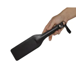 Шлепалка изготовлена из натуральной кожи. Рокоять имеет жесткую основу. Общая длина шлепалки 30 см, ширина 6,5 см. Цвет черный.
