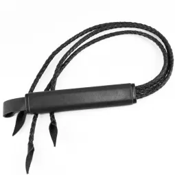 Плеть изготовлена из натуральной кожи. Имеет 3 плетеных хвоста и плоскоовальную рукоять. Цвет черный.