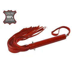 Плеть изготовлена из натуральной кожи и украшена тремя металлическими шипами. Длина рукояти15,5 см, диаметр 22 мм. Ударная часть плети состоит из 5 мм кожаных плоских лент, длиной около 25 см. Общая длина изделия 41 см. Вес – 105 гр. Цвет красный.