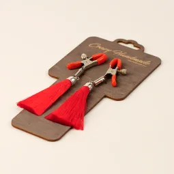 Зажимы на соски "прищепки" с кисточками из шелка. Цвет кисточек красный. Степень зажима регулируется. На фирменной подложке.